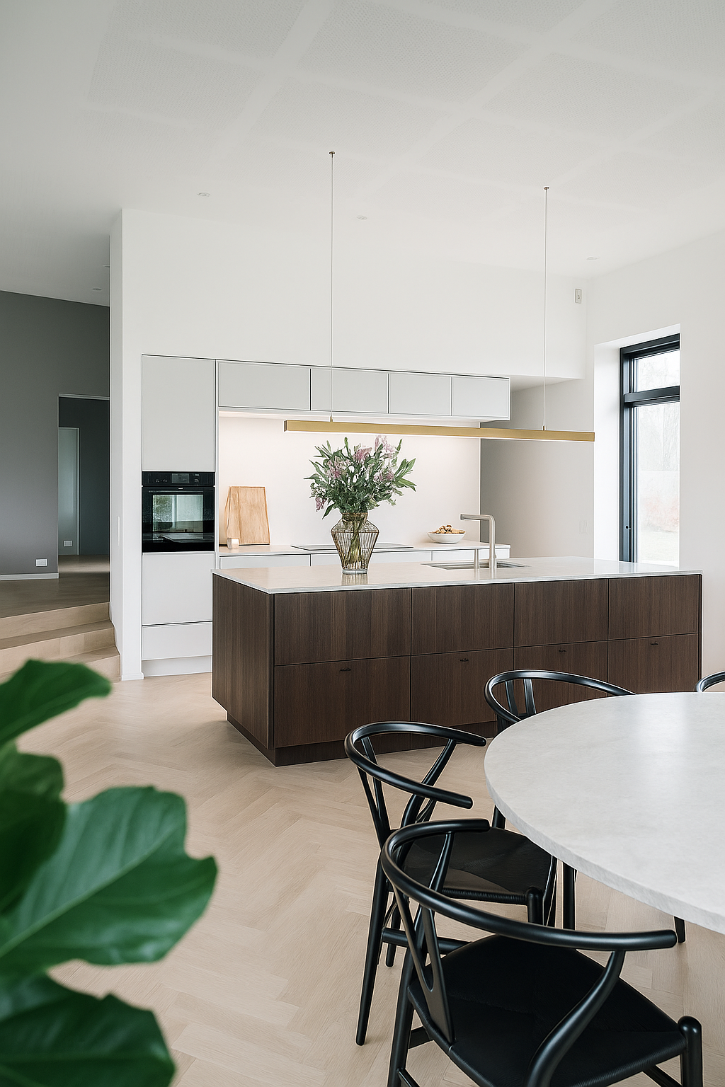 Køkkenet er husets naturlige samlingspunkt. Med sine rene linjer, massive træmaterialer og skræddersyede opbevaringsløsninger er det et mesterstykke i funktion og æstetik. De speciallavede skabe og skuffer er ikke kun smukke, men også utroligt holdbare – en egenskab, som familien har erfaret på egen hånd. Som en del af designet har familien valgt en kombination af mørke træskuffer og elementer i en lys blå farve, der går igen i både køkken og badeværelser. Den dybe varme fra det mørke træ skaber en elegant kontrast til den blå nuance, som tilføjer et friskt og moderne islæt. Kombinationen balancerer mellem det klassiske og det moderne, hvilket gør rummene både indbydende og tidssvarende.