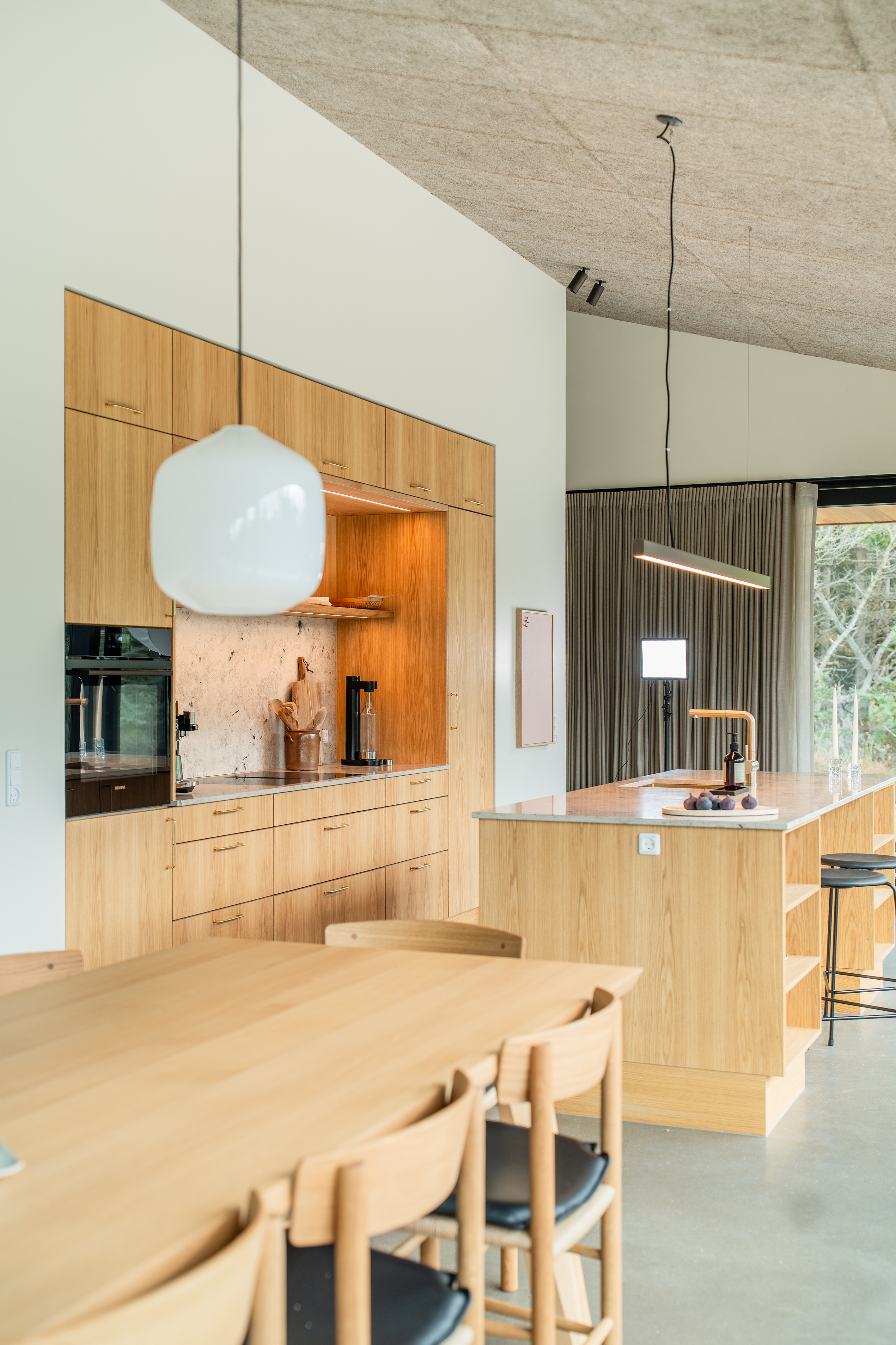 Dette snedkerkøkken i sommerhuset ved Blokhus er skabt med udgangspunkt i lyset, landskabet og det liv, der leves i feriehuset. Her mødes dansk design og snedkerhåndværk i et egetræskøkken, hvor hver detalje er gennemtænkt, og hvor funktion og æstetik går hånd i hånd.