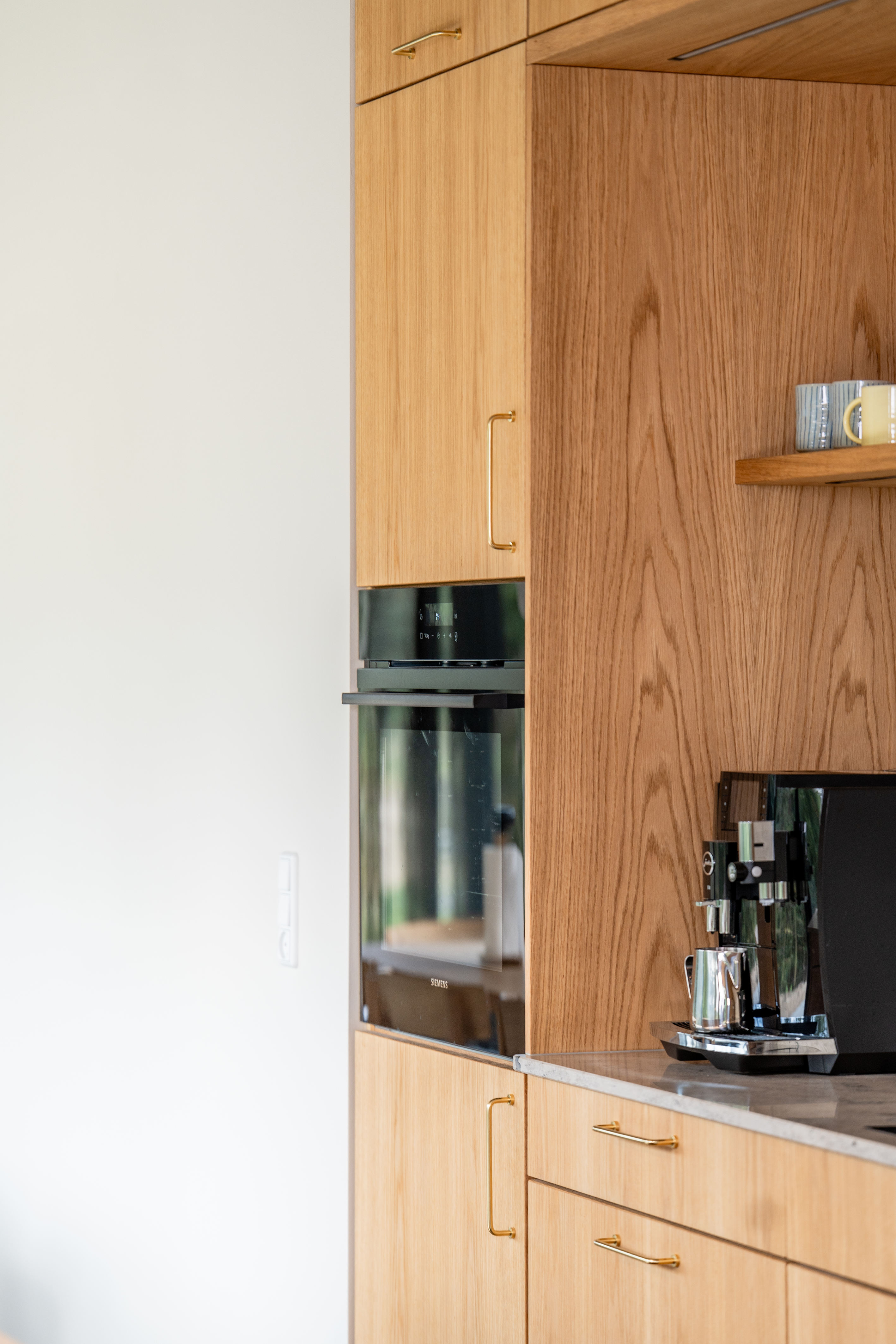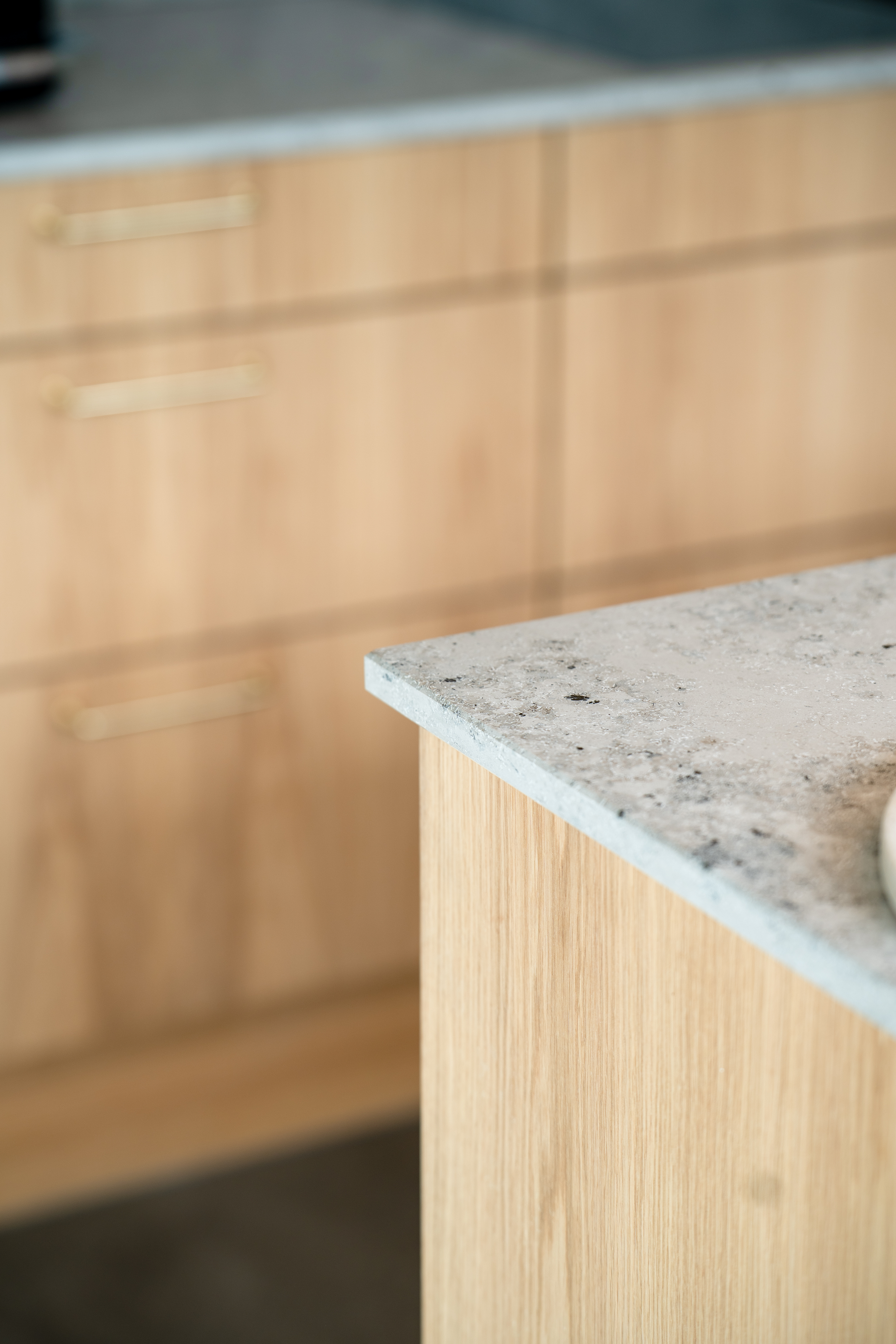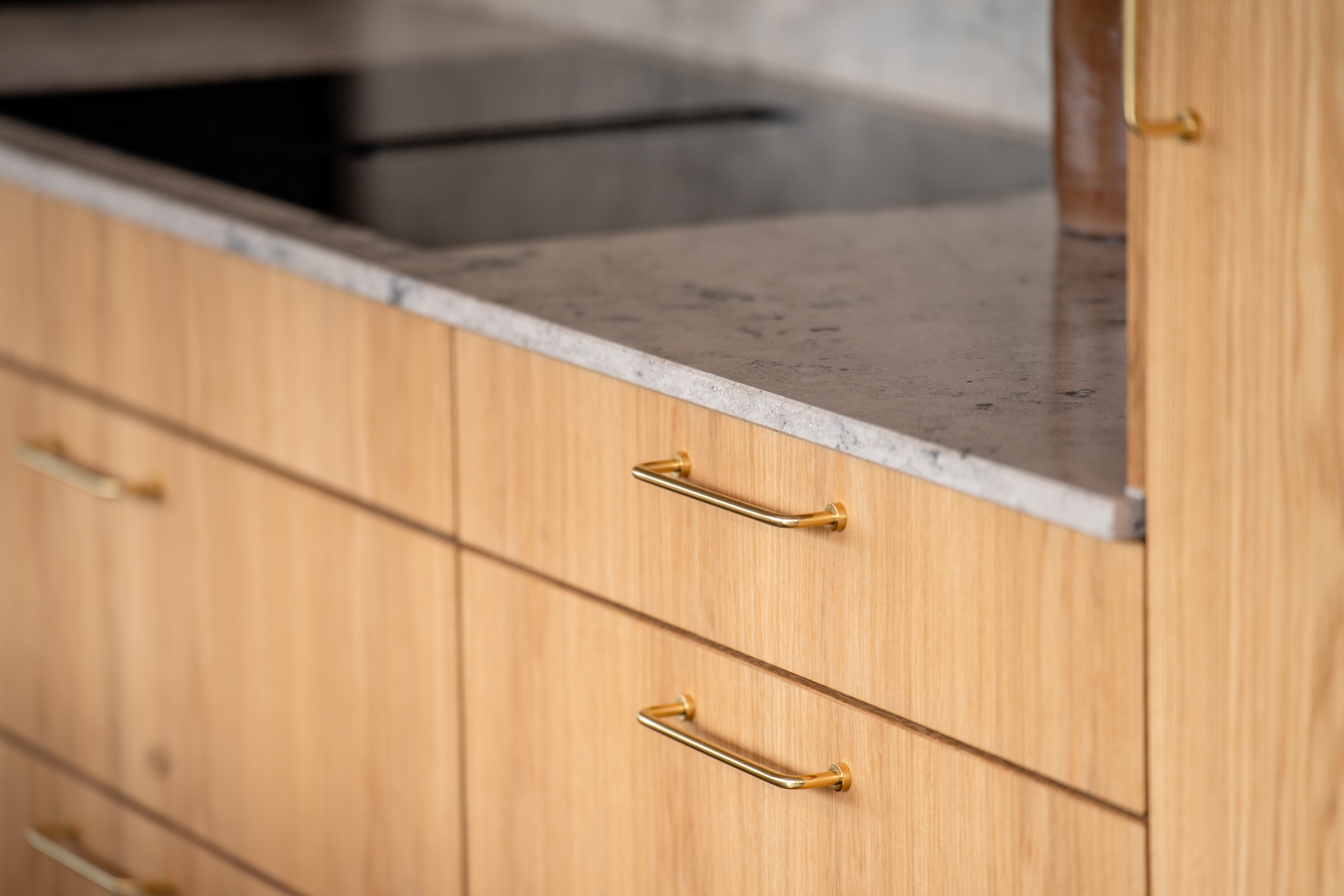 Hos Hanstholm Køkken tror vi på, at snedkerkøkkener skal være bygget til at leve i. Derfor er alt her skabt i solide naturmaterialer, der ældes med ynde. De håndlavede skuffer og låger er udført i egetræ med messinggreb, og bag de enkle linjer gemmer sig gennemtænkte opbevaringsløsninger, hvor alt har sin plads. Bordpladen og væggen i stenlook tilfører et strejf af luksus, mens den indbyggede LED-belysning under overskabet skaber en blød glød, der gør køkkenet i sommerhuset både praktisk og stemningsfuldt – fra morgenkaffe til aftenhygge.
