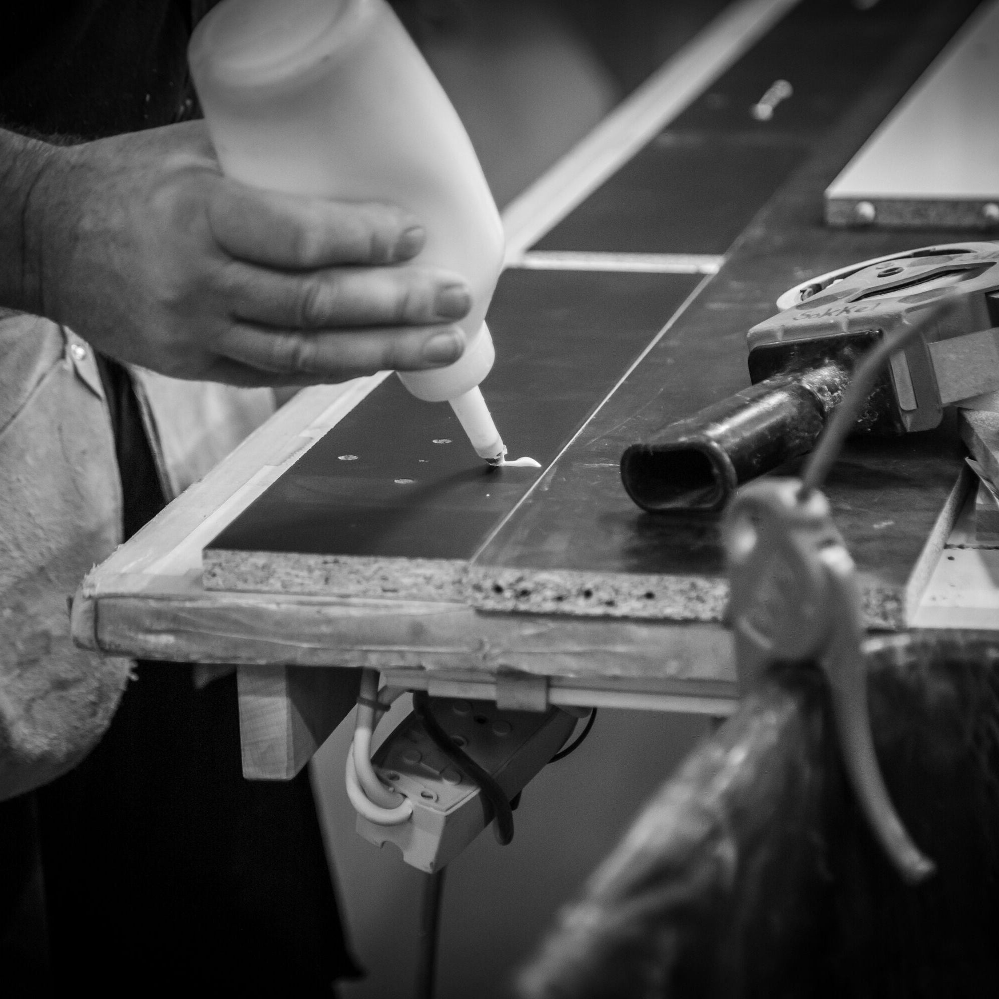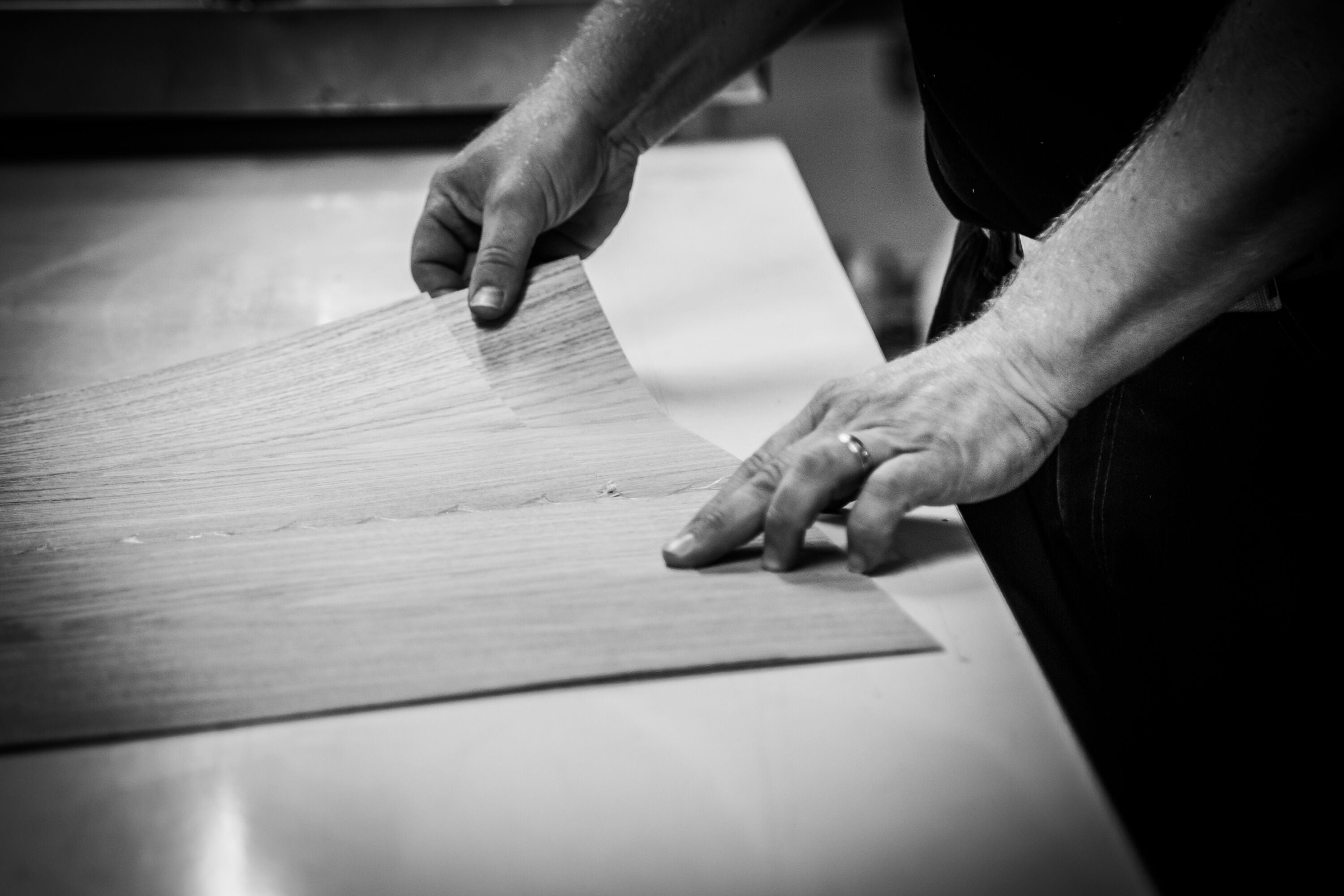 Når fineren pålimes, gør vi det med varme, tryk og timing. Her mødes håndværk og materiale. Resultatet er en overflade, der har sjæl – og som du kan mærke med fingerspidserne.