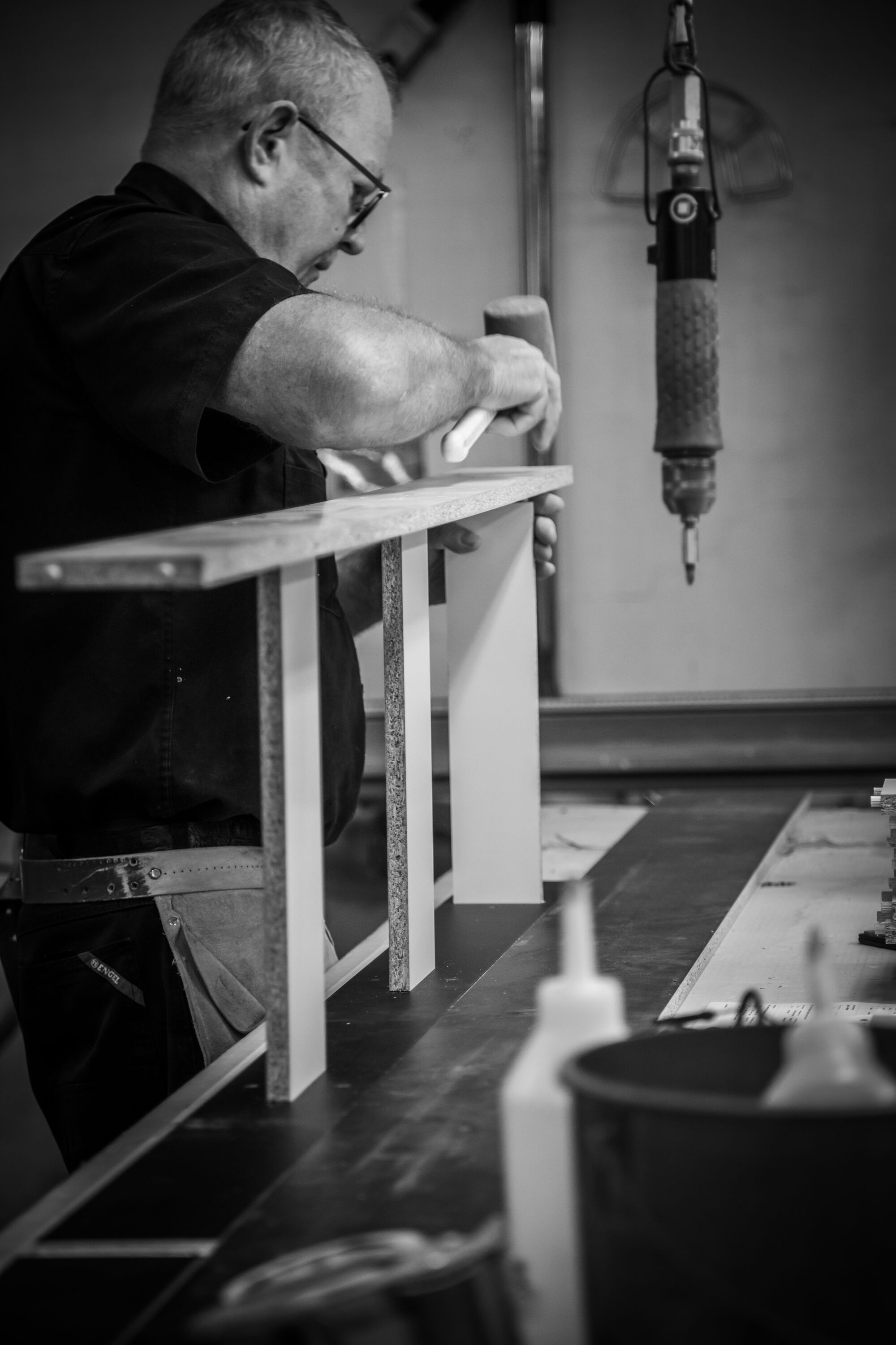 Vi bygger det ikke med skruer og beslag, der skal efterspændes – men med solidt samlearbejde, trædyvler og lim, presset i ro og præcision.