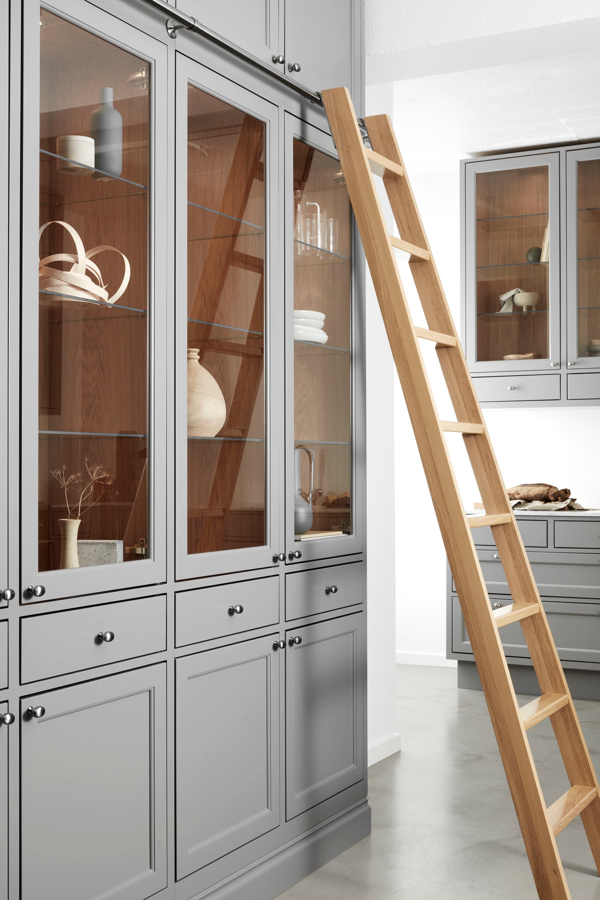 Et gråt køkken giver elegance og balance.