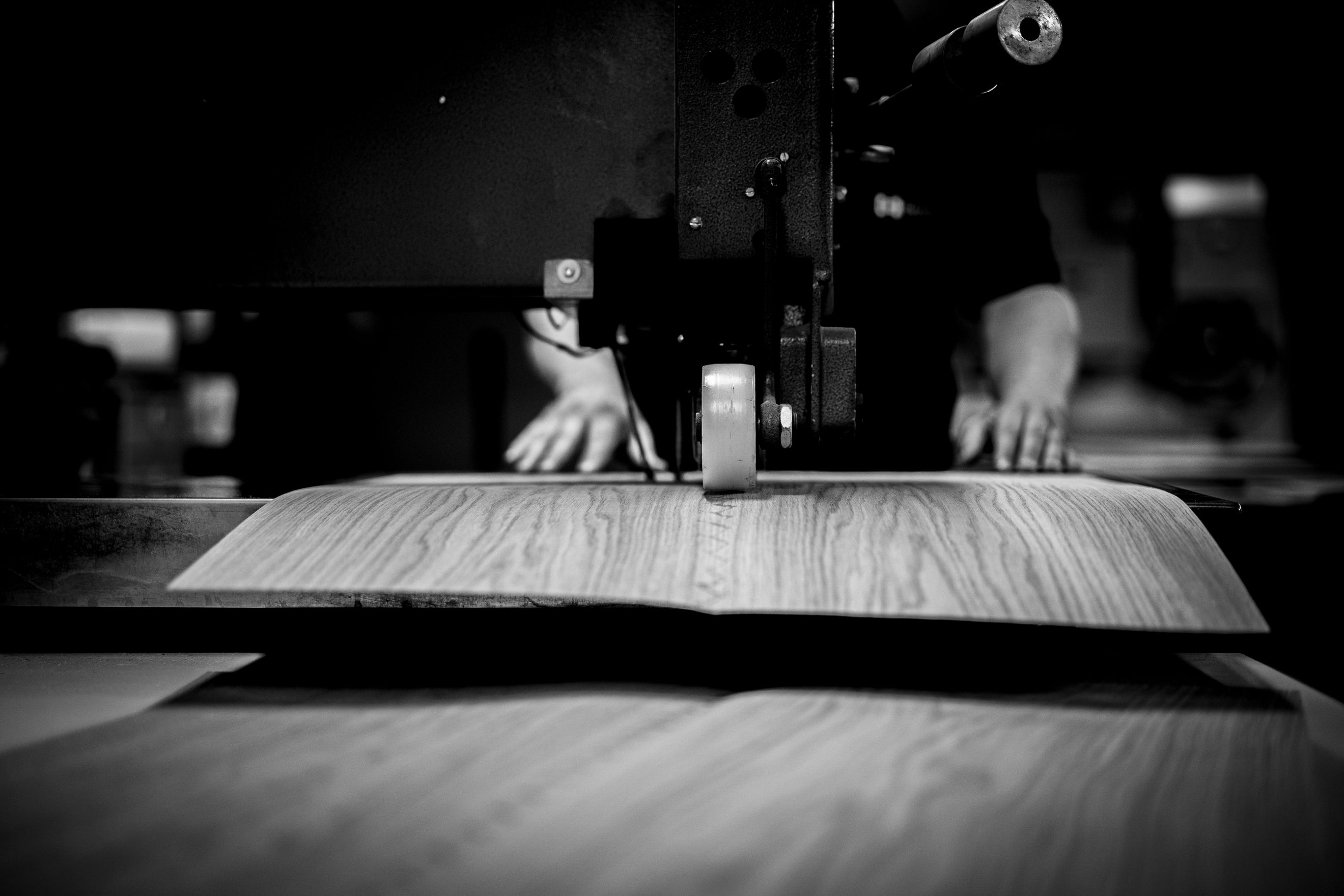 Når fineren er syet, pålimes den omhyggeligt. Vi bruger en kombination af varme, tryk og lim, der sikrer, at fineren ligger tæt og fast på underlaget. Her handler det om balance – for meget varme, og fineren bliver sprød; for lidt, og limen binder ikke optimalt.