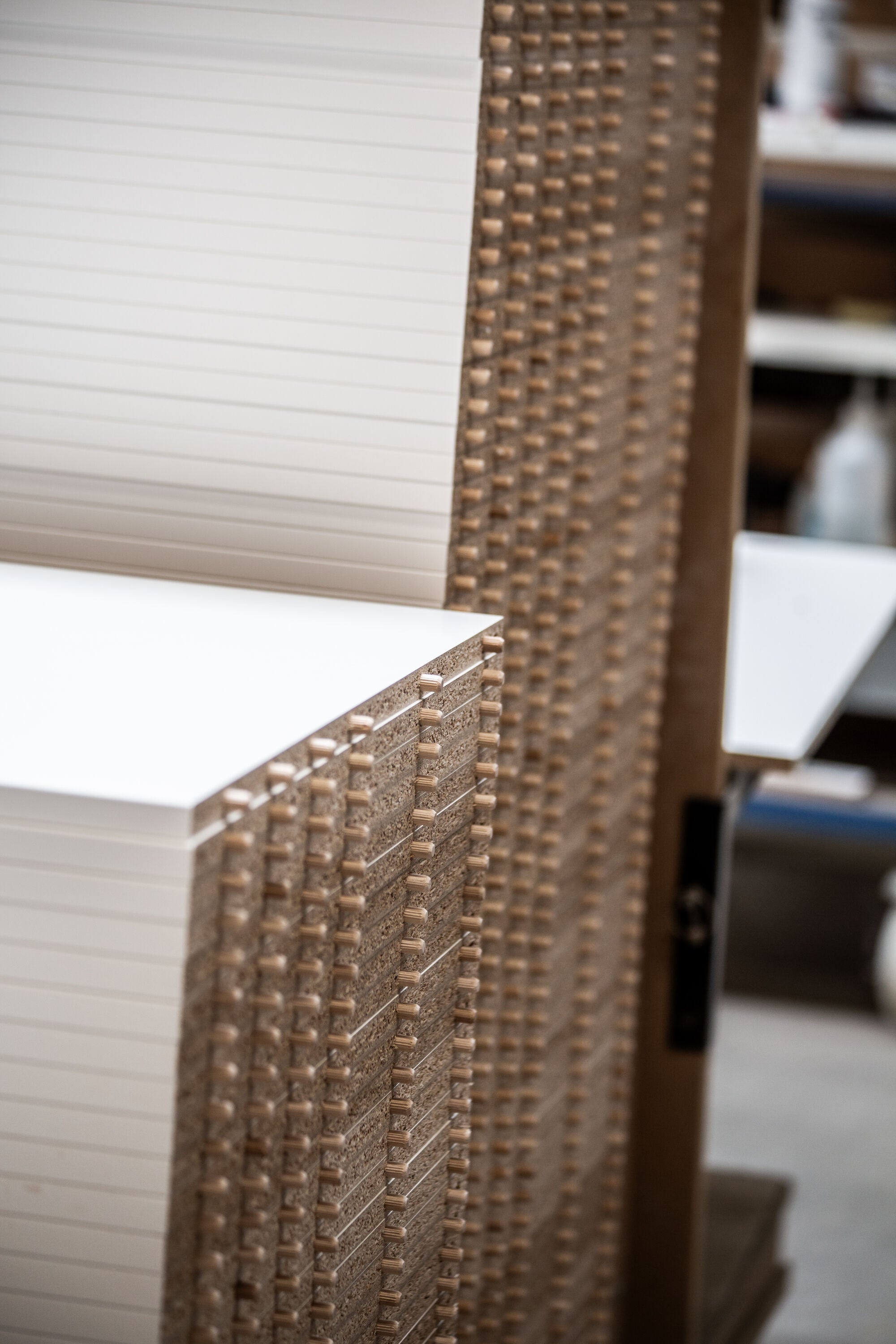 I vores produktion kan du høre en særlig rytme, når korpusserne bliver samlet. Lyden af træ mod træ, et let dunk, og så den dybe stilhed, når limen begynder at binde. Det er her, køkkenet får sin styrke. Det er håndværk, du ikke ser – men som du lever med hver dag.