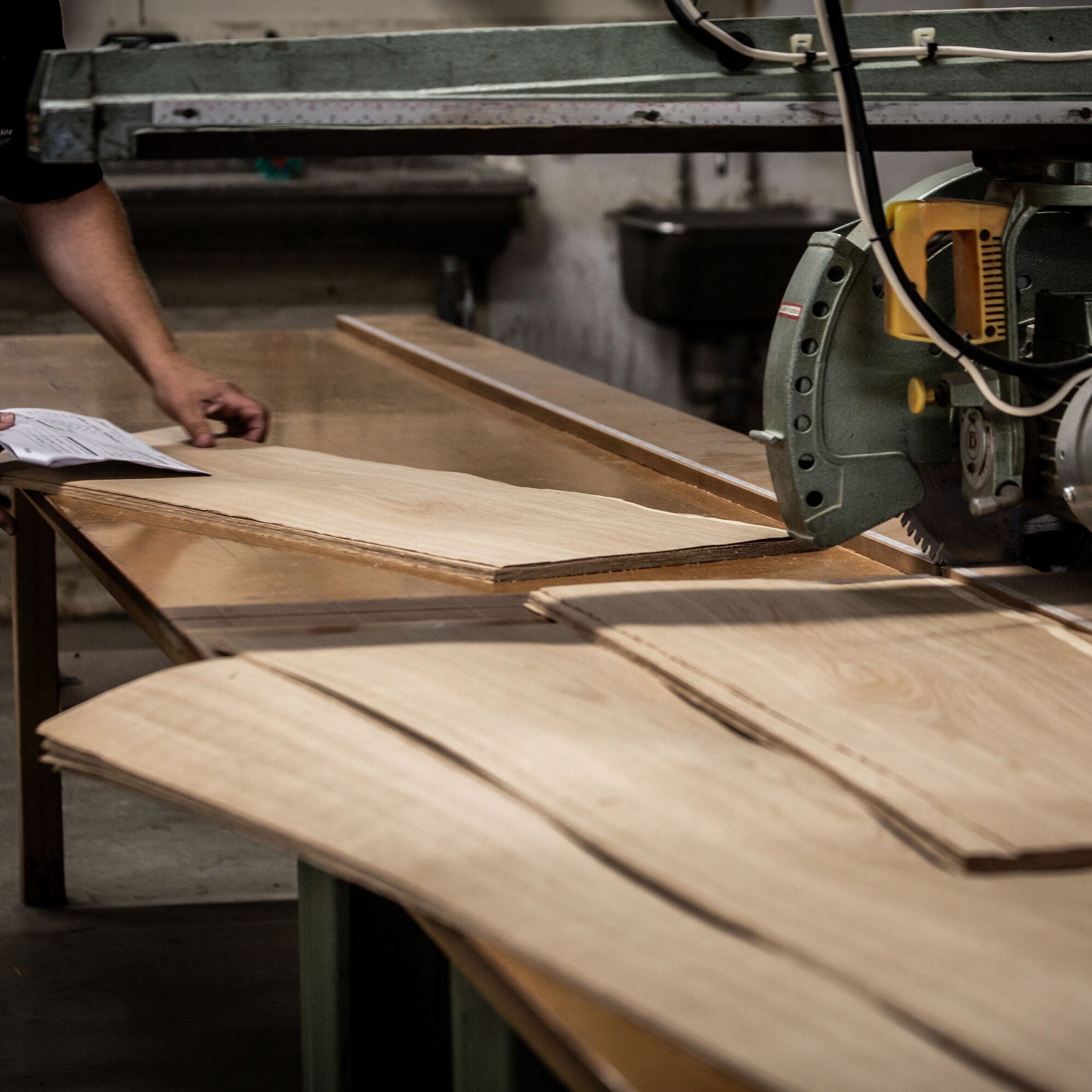 Først lægger vi den første lak eller grundbehandling. Så står pladen og tørrer. Dernæst tager vi fat. Vi bruger fint sandpapir, og vi sliber – ikke for at fjerne, men for at forfine. Vi tager de små ujævnheder, de mikroskopiske fibre, der har rejst sig i træet, og lægger dem ned igen. Det handler om følelse. For selv det mindste overset hjørne kan ændre fornemmelsen, når hånden møder materialet.