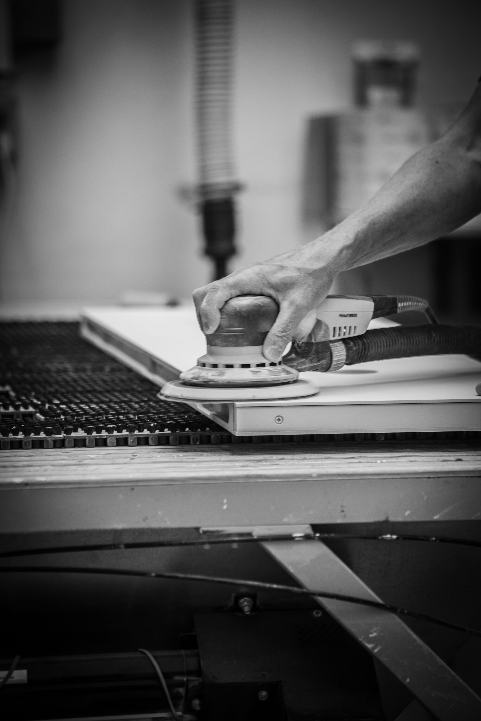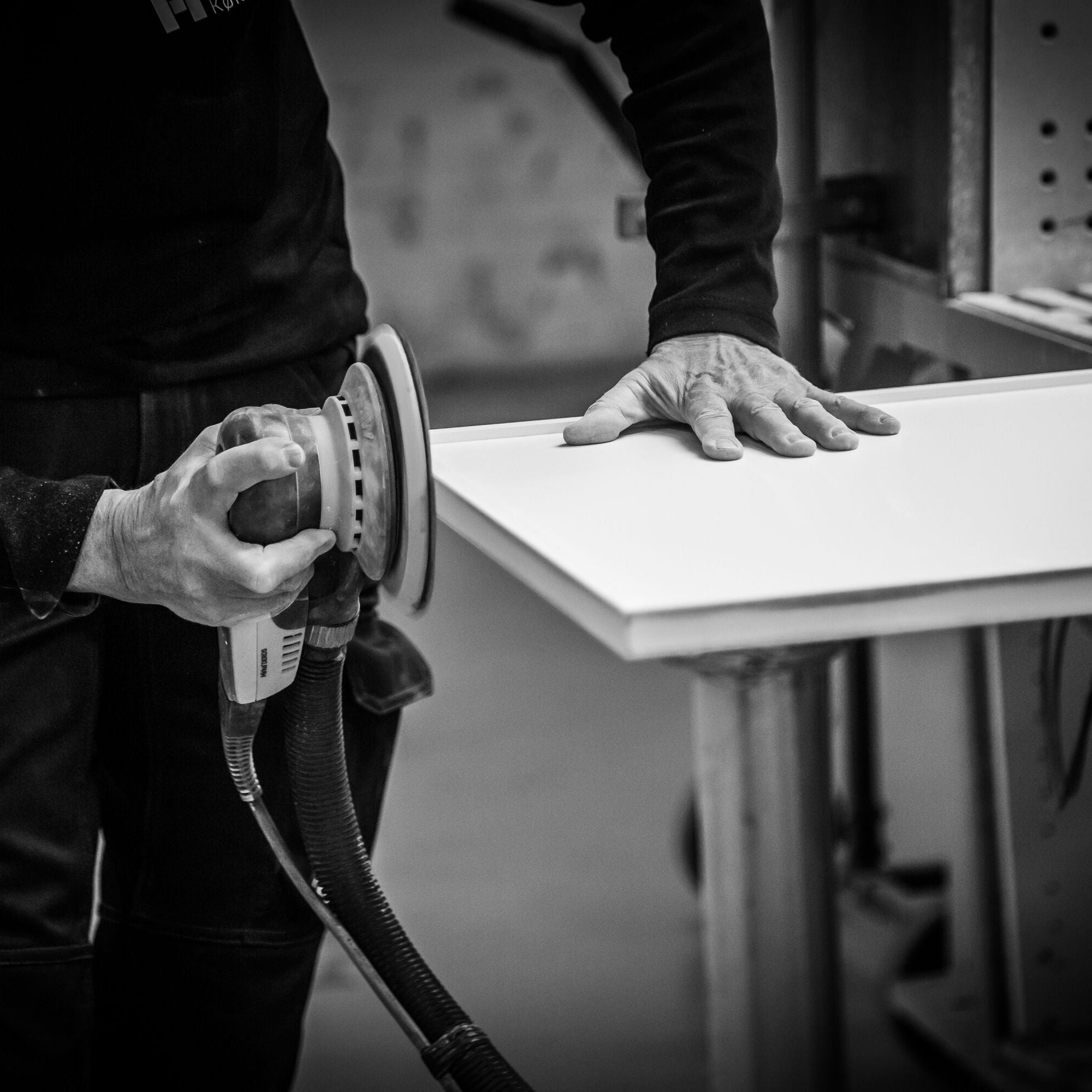 De fleste ser ikke denne del af processen. Det er ikke spektakulært, der er ingen store maskiner eller blinkende lamper. Det er bare en hånd, der bevæger sig frem og tilbage over en plade. Men netop her skabes forskellen mellem en almindelig overflade – og en, man får lyst til at røre ved.